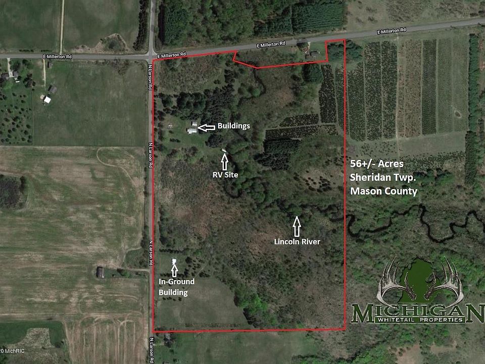 Eastern Mason County retreat filled with wildlife and natural features providing a complete outdoor experience! The property consists of numerous trails, open fields, hardwoods, winding river w/thick surrounding wetland area providing dense cover, fishing opportunities, pine trees, old well & septic location, buildings for equipment storage, electricity on-site, apple orchard and much, much more! Main entrances are gated for security. Permit already approved to dig a pond if desired and numerous potential build sites on both roads! Don't miss out on this multi-functional property and give me a call today to see! Information deemed correct, but not guaranteed or warranted & aerials are not surveys.