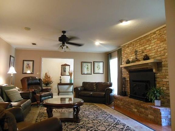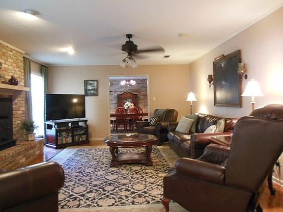 Immaculate and well cared for 3br/2ba brick home, original owner, never flooded on 6+ acres. Home has public water and private well, 36.9'x14.6' family/entertaining room with grill and bar, formal dining room, formal living room, attached double carport with storage room, detached 24'x40' double garage/workshop (insulated, electric, water, heated and cooled), pump shed, custom brick patio. Natural Gas available. Could easily fit a mobile home on property. Easy access to interstate, shopping, university.