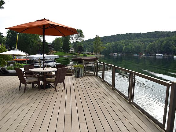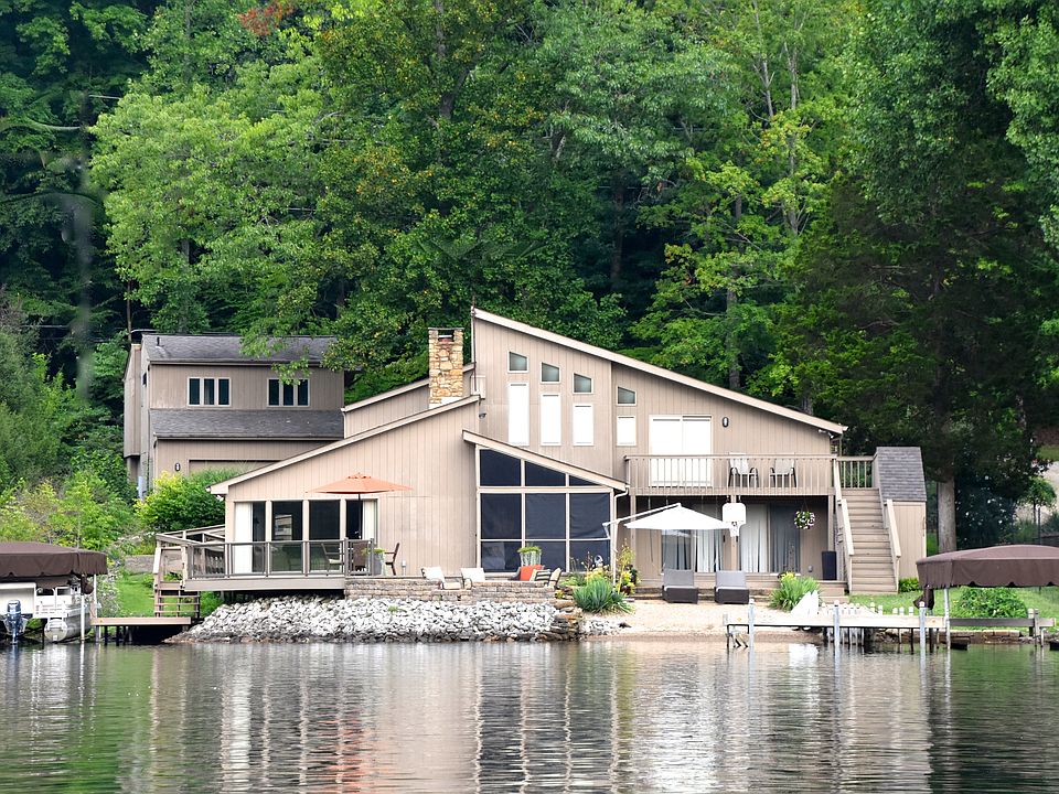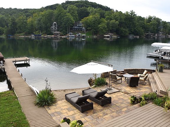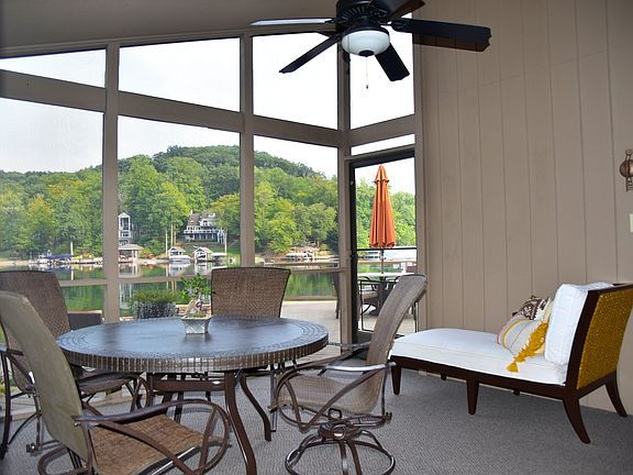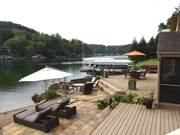 Open concept, contemporary lakefront home in great location on Grandview Lake. Home is situated on the west side of the lake in a desirable, non-idle zone area. Sweeping lake views in all the main rooms of the house. Upper level Large Master Bedroom Suite with vaulted ceilings, full office area & extensive closets (cedar-lined), all custom cabinets; Master Bedroom has incredible lake views and a balcony overlooking the lake with direct access to the water. Updates include custom cabinets and wood floors in the kitchen, bar/entertainment area, and bathroom along with granite countertops. Middle level includes 2 bedrooms and laundry area. Main level includes dining room & living room overlooking the lake with wood-burning fireplace, full bathroom, optional 4th bedroom currently used as a family room, kitchen, eat-in area, bar/entertainment space with under-cabinet refrigerator and ice maker. 2 car attached garage with large attic storage space; 2 car finished detached garage with guest quarters above. Extensive outdoor deck space in trexs material; screened-in porch; 2 power boat lifts. Owner (812)350-3197