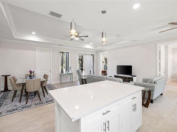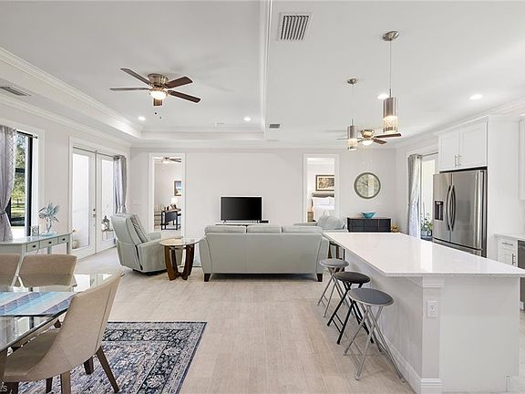 Discover the charm and tranquility of this stunning newly built and better than the new construction three-bedroom plus den home, set among a sprawling 1.14-acre fully fenced and gated property. Fencing can be a costly project with a new construction home, but here it is completed for you. This concrete block home in Naples with an attached two-car garage combines convenience and luxury with serenity of nature, featuring high-end finishes, gorgeous tray ceilings in the primary bedroom and living room, 10-plus-foot ceilings, crown molding and high baseboards throughout. Gourmet kitchen has a whole-home 500-gallon reverse osmosis system (that is not always a standard feature of new construction), white quartz countertops, 42-inch wood cabinets, and bright, airy layout ideal for the culinary enthusiast. The new washer and dryer are included in the sale. Flooring is elegant and durable 6-by-24-inch light wood look porcelain tile throughout, offering beauty and durability. Outdoor space has a deep lot ideal for a pool, garden, shed or guest home, with added privacy and security of fully fenced front and backyards. Water system is enhanced with a new 500-gallon reverse osmosis water system. Beautiful furnishings are negotiable. This home is on a quiet street, offering a peaceful retreat while having excellent high-speed internet and being conveniently close to essential amenities. Proximity is less than one mile to Golden Gate Blvd and the new Fire Station 74 and EMS, five minutes to new Everglades square mall, and 10 minutes to Publix and CVS. No HOA fee so enjoy freedom and flexibility without additional costs. Surround yourself with nature with nearby wildlife, adjacent to the expansive 24,000-acre Wildlife Refuge, offering a 30-minute scenic trail system. Gore Nature Center is a short distance away so explore this unique trail system which showcases forests, cypress, ancient limestone sea beds and ephemeral ponds. This property is not just a home, it's a lifestyle, merging luxury living with untouched beauty of Florida's natural landscapes. Don't miss your chance to own this gem in Naples!