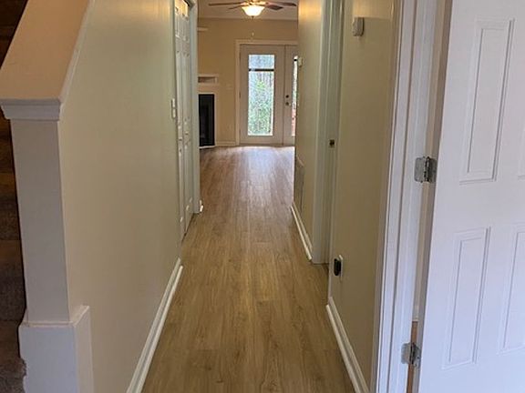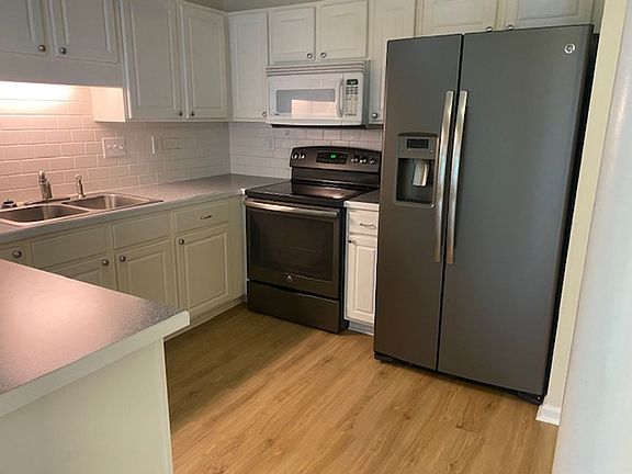 Brick townhouse, Interior unit, 2 story, 3 bedroom, 2 bath. Over 1400 sq. ft. Freshly painted and light & airy - Wood floors throughout and carpet only in master bedroom upstairs, and stairs, ceramic tile in both bathrooms. Gas fireplace. Open plan living room, kitchen, dining area, leads to back deck through beautiful French doors, plus a small storage unit, backs up to creek. One bedroom & bath downstairs, other 2 beds and bath upstairs. Updated kitchen with subway tiles, Stainless steel graphite gray refrigerator & range, also includes a dishwasher & microwave. Laundry closet with hook ups under stair case downstairs INCLUDED are water, sewer, trash, 2 designated parking spaces. No pets per HOA No smoking