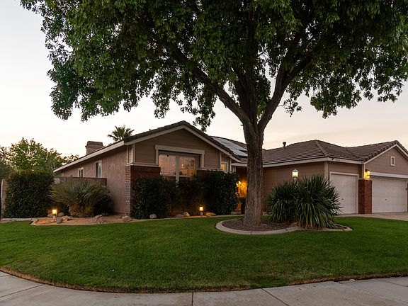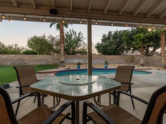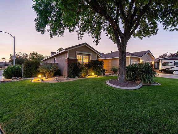 Looking for a single story pool home on a corner lot with RV access potential?? Your search is over! This beautiful property is sure to impress from the moment you pull up and see the meticulously manicured landscaping, the oversized driveway and the 3 car garage. Inside is just as impressive. The generously sized living room has vaulted ceilings, tile floors and a view of the amazing back yard as well as the stunning kitchen. The kitchen has upgraded counters and backsplash, a center island, stainless steel appliances, ample counter and cabinet space and is open to the dining area. The dining area has a a stone featured fireplace and leads directly to your back yard oasis. Like to enjoy the warm summer days out by the pool or perhaps the wonderful summer evenings by the Bar-B-Que with family and friends? Well look no further. The back yard has a large covered patio that overlooks your private pool, grassy area, palm trees and 2 sides yards that provide ample space for
