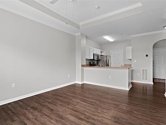 Don’t miss your chance to own this beautifully updated, move-in ready top-floor condo in the gated and meticulously maintained Terraces of Dunwoody community! This spacious, one-level end unit offers quiet serenity, a larger footprint and is perfectly positioned in a prime Dunwoody location just minutes from shopping, dining, and quick access to I-285 and GA-400. Step inside to find freshly painted interiors that feel bright and welcoming. An elegant arched doorway leads from the foyer into a sunlit open-concept living and dining area, featuring a dramatic tray ceiling with crown molding and a wall of windows that flood the space with natural light. Step out onto your private covered balcony and take in peaceful, tree-lined views—your own serene retreat. The full-featured kitchen opens to the main living space and boasts ample cabinet storage and counter space, a convenient breakfast bar, freshly painted cabinets, and newer stainless steel appliances, including an electric range and refrigerator. A newer dishwasher and built-in microwave add to the functionality. The generously sized bedroom includes a walk-in closet with a built-in storage system and enjoys soft, natural daylight. The bathroom features a combination tub/shower, extended vanity, and an additional storage cabinet. Additional perks include an assigned parking space close to the elevator and mailboxes. Water and valet trash service are included in the low HOA fee, and residents enjoy access to a sparkling pool, fitness center, clubhouse, outdoor grill area, and dog walking paths. The Terraces of Dunwoody is FHA-approved and offers an unbeatable combination of location, value, and lifestyle. Come see why this condo is the perfect place to call home!
