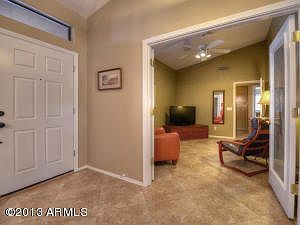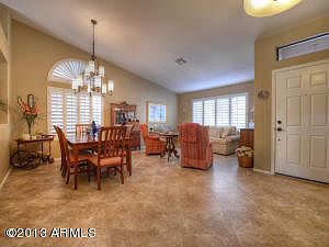 Impeccably maintained home features a versatile open floor plan with granite kitchen counters, large center island/breakfast bar, plantation shutters, porcelain tile in all the right places, new carpet, custom paint, updated light fixtures and ceiling fans. This energy efficient home has a new (2012) Trane 16 SEER Air Conditioner and Furnace with programmable thermostat, and R-38 insulation in the attic. Theres a Gas Fireplace in the family room and French Doors that lead to the South facing backyard with covered, Saltillo tiled patio and easy to maintain landscape plus citrus trees! The Front, flex room has French doors and could be made into a 4th bedroom or a study. All of this plus a 3 car garage and ideal location makes this a Must See home! See Doc tab for more features.