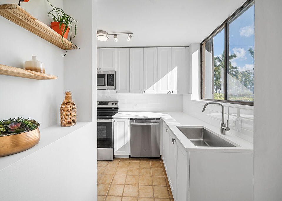 Clean, modern style tastefully updated with a twist of mid-century flair, nestled in the very desirable Fountains community.Very cozy but so spacious with ample storage, this gem boosts many beautiful finishes that complement the renovations.The kitchen welcomes you with just the right amount of natural light. Beautiful new cabinets, quartz countertop, extra large under mount SS sink and brand new SS appliances.Downstairs flooring and baths have a gorgeous earthy color tile, while the staircase and upper level floor is a wood like low maintenance vinyl. Beautiful finishes complement the updated bathrooms as well. Quartz countertops, modern mirrors and light fixtures, brand new cabinetry.Accordion shutters throughout and additionally, roll down shutters in screened in patio. Assigned parking just outside the front door.Trevi Court has its own private pool available to residents and guest. As a resident, you also have access to Craft hall where you can meet other residents for games and social activities.The Fountain is a wonderful manned gated active community that offers a diverse style of homes as well as different lifestyle options and activities.