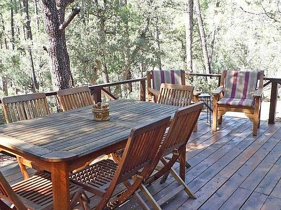 This 3 bedroom 1 1/4 bath cabin sits on a wooded acre and has been upgraded throughout. Travertine and wood floors set the stage for the warm atmosphere created by the fireplace in the great room. Both baths and kitchen have been upgraded. The covered deck has been extended to create a perfect place to enjoy the outdoors. Pella windows and doors are throughout. The corral is used by the owners as a vegetable garden with the garden being watered from the 2000 gallon tank installed to capture grey and rain waters. The garage has a nice work area. There is a separate storage shed on the property and there are even security cameras installed. There is also a large fenced area on the rear of the property perfect for pets.