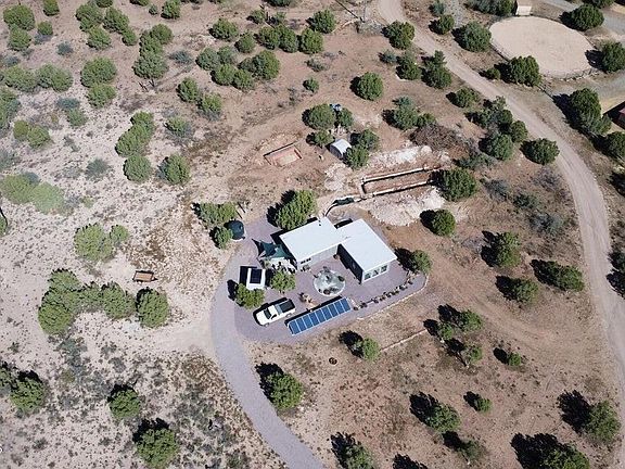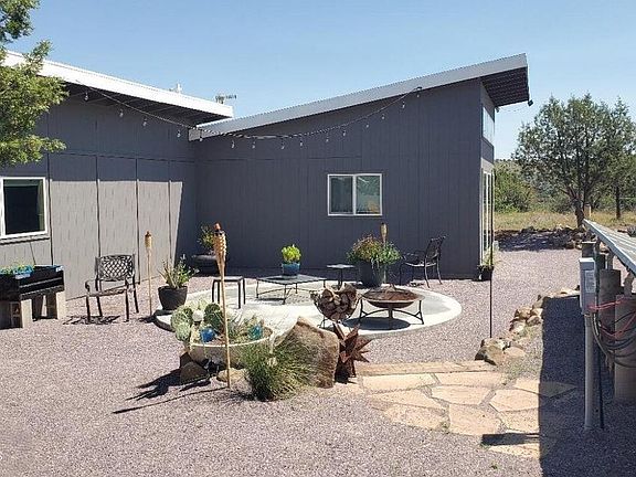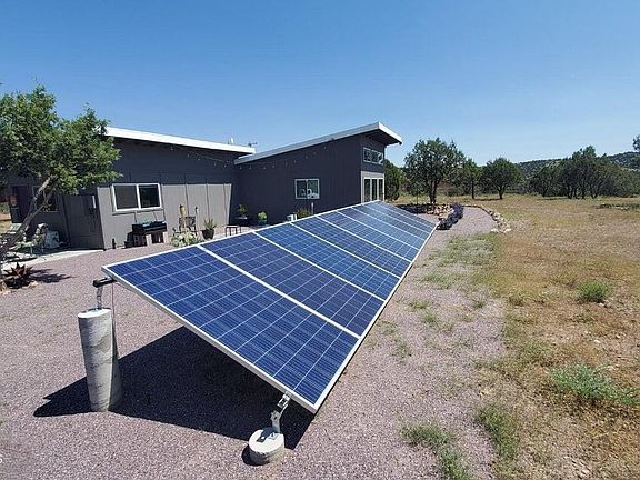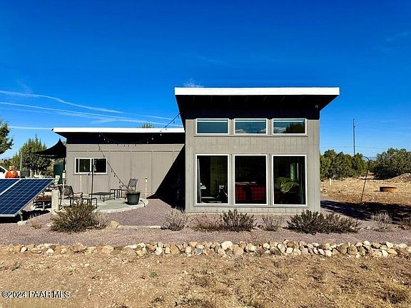 If you have wanted off grid living with still being connected to APS then look no further! Welcome to this beautiful 2 bedroom, 1 bathroom, 823 square foot home with an open floor plan and high ceilings situated on 2.6 acres in a truly lovely area of Chino Valley. Property includes 2 sheds (tools convey), detached solar & storage room, the beginnings of an in-ground green house and new permitted septic system w/ 1000 gal tank. Home has Google assistant smart features, including some switches and outlets, AC heat pump, cameras, door lock, and bedroom upper blinds. 48'' wall mount TV in living room and projector TV and screen convey, as well as new king bed, black couch, glass top table, stainless fridge, & washing machine. See documents tab for more information. Schedule a showing today!