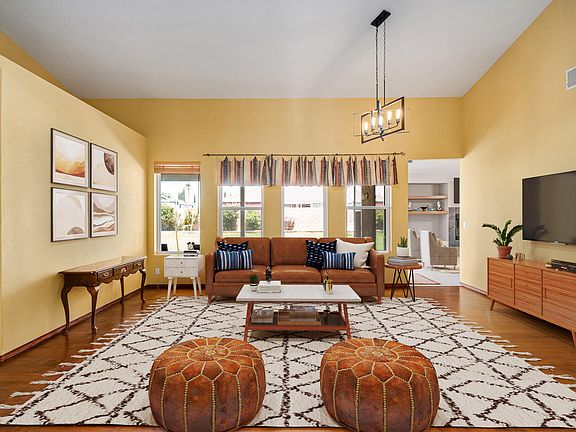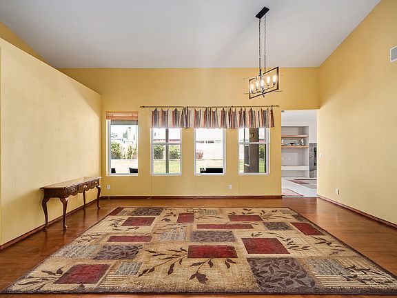 Beautiful large SINGLE STORY 3 bedroom plus den home located on a nearly 10,000 sq. ft. lot. Wonderful layout with high ceilings and lots of windows. The living room area has volume ceilings and is very spacious. Hard surface flooring throughout with the exception of 2 of the bedrooms are carpeted. The kitchen is large with loads of counterspace and storage. The kitchen is adjacent to the family room area with built-in entertainment alcove and lovely fireplace. The primary bedroom is on the other side of the home from the secondary bedrooms and is ample size with custom sliding barn door custom walk-in closet to store all of your attire. The primary bath includes closet space as well as a dream custom shower with multiple water jets. There is a convenient inside laundry room with washer and dryer hookups as well as a flolding area and storage cabinets. The home has air conditioning and heating as well as an economical addition of a whole house evaporative cooling system. The 3 car garage is large and has direct access to the home. The backyard includes fruit trees and a large covered patio perfect for entertaining or just relaxing and viewing the lovely yard. There is plenty of room for a pool!!!