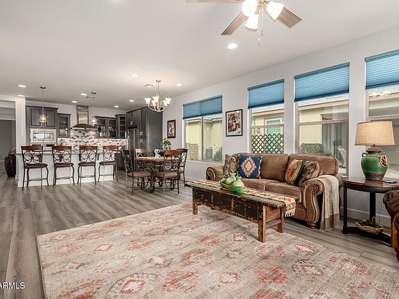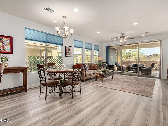 Don't miss the chance to own this stunning 2 bedroom, 2 bathroom home in Wickenburg Ranch—where luxury meets the charm of the Old West! The open floor plan features a gourmet kitchen with granite countertops, upgraded cabinets, a stylish tile backsplash, and a spacious island that seamlessly flows into the great room, filled with abundant natural light. A versatile den/office space adds flexibility to the layout, while the primary suite offers a spa-like retreat with dual sinks and a large custom-tiled walk-in shower. Wood-look tile flooring runs throughout the home - no carpet for easy maintenance. Step outside to a serene backyard oasis with a covered patio, pavers, and organic desert landscaping. Enjoy resort-style living with exclusive amenities, including a world-class golf course, state-of-the-art fitness center, tennis and pickleball courts, a resort-style swimming pool, and so much more.