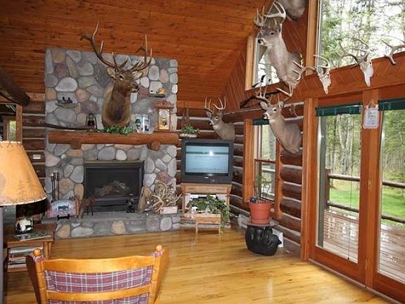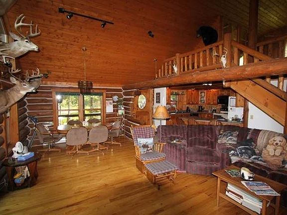 This gorgeous 3 bedroom full log home sits privately on just over 86 acres! The land offers an incredible network of private trails and multiple food plots! There are numerous apple trees planted along the edges of the food plots, along with a fenced garden area planted with pumpkins the goodies deer love! Wildlife also love water, and here you'll find 3 small watering holes, along with a stream that winds through the property, yet is passable over the concrete span bridge. There are 3 permanent deer stands strategically placed on the property and have scored many trophy deer and bear! This hard work created a property loaded with wildlife! Enter into the home under the attractive full length covered porch. Here you'll find a beautiful great room complete with a wall of glass windows, cathedral ceiling and massive stone fireplace. There is a nice size dining area and a country kitchen featuring pine cabinets, pantry and eat in breakfast bar. Located in the Scenic TFF Wilderness area.