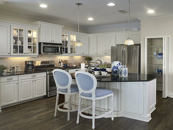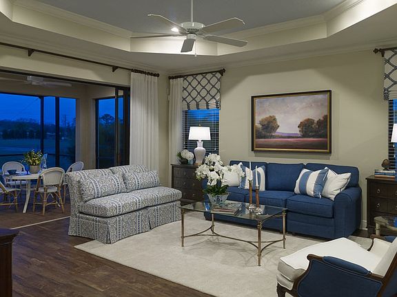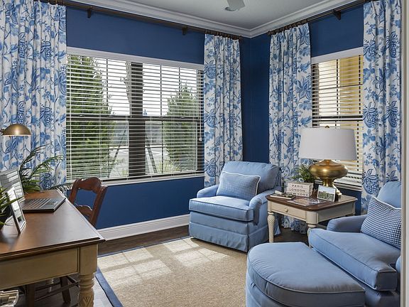 The Tidewater B is two-bedroom, two-bath twin villa home designed by Neal Communities features a spacious layout with open living areas. The home includes an open great room, dining area and gourmet kitchen with island. A den offers the perfect space for a home office, while a covered lanai at the back of the home provides a lovely space for enjoying the outdoors. The master suite bedroom includes the option of a window or door to the lanai. The suite also features two closets and a bath with dual sink vanities, walk-in shower and private water closet. A walk-in closet and proximity to a full bath makes the second bedroom a great guest room. This home is an excellent choice for a small family, individual or as a secondary of vacation home.