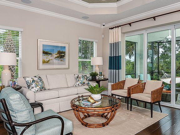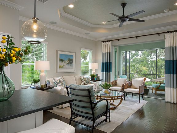 The Crystal Sand by Neal Communities is comfortable, accommodating and charmingly attractive. The common living area is an open expanse including the gourmet kitchen and great room. The island with breakfast bar in the kitchen can be extended if preferred. A nearby separate dining room offers the option of being a den. The inviting great room can include the option of a coffered ceiling and features glass sliders leading out to the covered lanai. Off the great room you enter the master suite bedroom with optional door that opens to the lanai. The suite's two closets include a walk-in and the master bath features two sink vanities, a walk-in shower and private water closet. The second bedroom is situated convenient to a full bath.