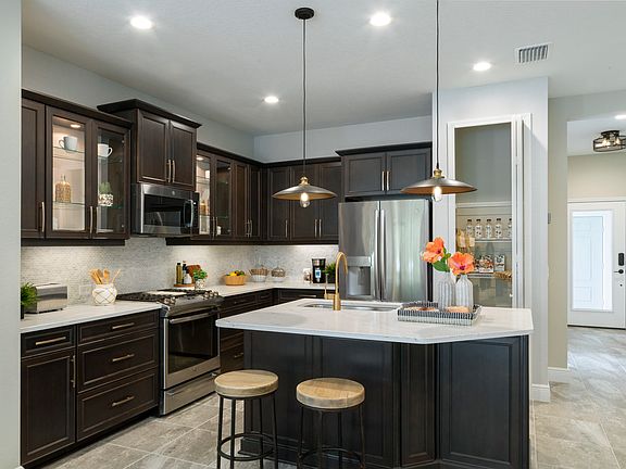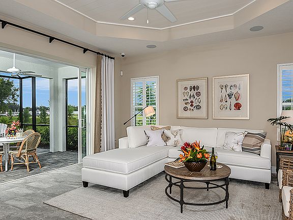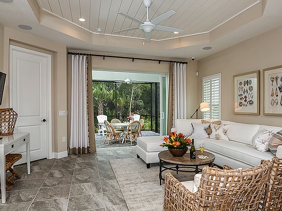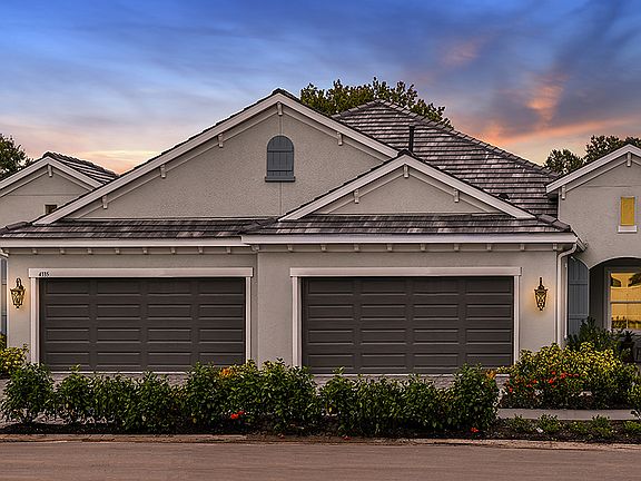 The Tidewater two-bedroom, two-bath twin villa home designed by Neal Communities features a spacious layout with open living areas. The home includes an open great room, dining area and gourmet kitchen with island. A den offers the perfect space for a home office, while a covered lanai at the back of the home provides a lovely space for enjoying the outdoors. The master suite bedroom includes the option of a window or door to the lanai. The suite also features two closets and a bath with dual sink vanities, walk-in shower and private water closet. A walk-in closet and proximity to a full bath makes the second bedroom a great guest room. This home is an excellent choice for a small family, individual or as a secondary vacation home.