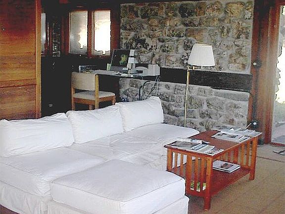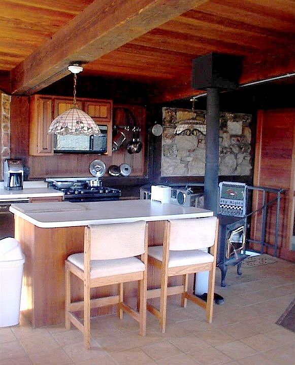 Passive solar home. Hand laid rock walls 1 1/2 feet thick. Lower level earth bermed on 3 sides for energy efficiency. Southern exposure in all living areas. Pella windows & doors. Hand crafted redwood cabinets. Construction: huge antique beams in the upstairs vaulted ceiling. Hand-made concrete tile throughout (part of the passive solar design.)