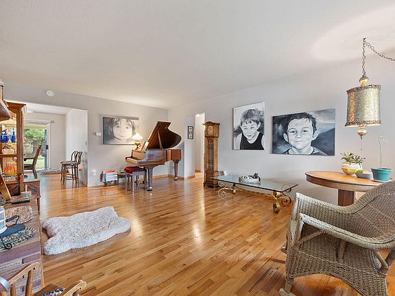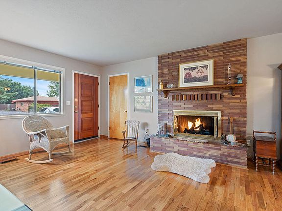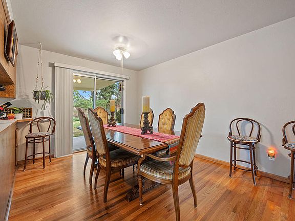 This APPEALING home has been well maintained! Beautiful hardwood floors in the living room, dining, hallway and ALL bedrooms (a couple bedrooms have carpeting over hardwood). The living room has a fireplace with gas insert. Large dining area with sliders opening out to a covered patio. The kitchen has custom oak cabinetry with nice pantry cabinet and an exterior door to the huge side yard. (Side yard is a great spot to open the fence and park your RV.) Back property line has mature evergreen trees and there's no neighbors behind. There's a nice utility building in the back corner. The composition roof is NEW!