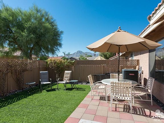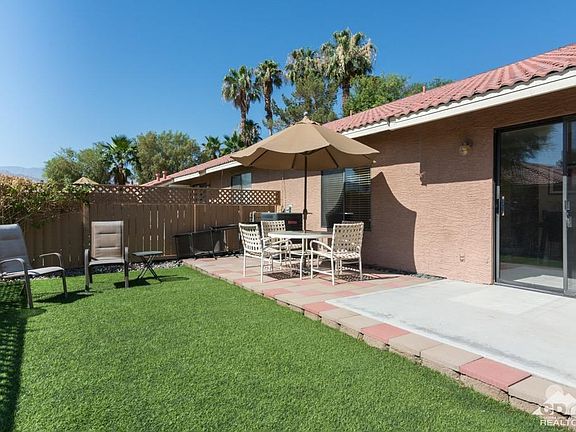 Beautiful Turnkey furnished condo at Palm Lakes with no one above you. 2 bedrooms, 1 bathroom this condo is on trend with beautiful light and bright white kitchen, great room with lots of natural light. Large backyard patio with faux grass and low maintenance landscaping. Did I mention it was being offered turnkey furnished? This is the perfect unit with rental history if you are looking for an investment property. Just bring your suitcase and you are ready to enjoy all the Desert has to offer. Resort like guard gated community with beautiful views of lake, fountain, greenbelt areas, 2 pools, spa, recently remodeled fitness center & clubhouse, dry sauna, sand volleyball court, and 2 night-lit tennis courts