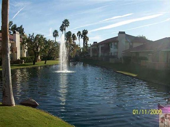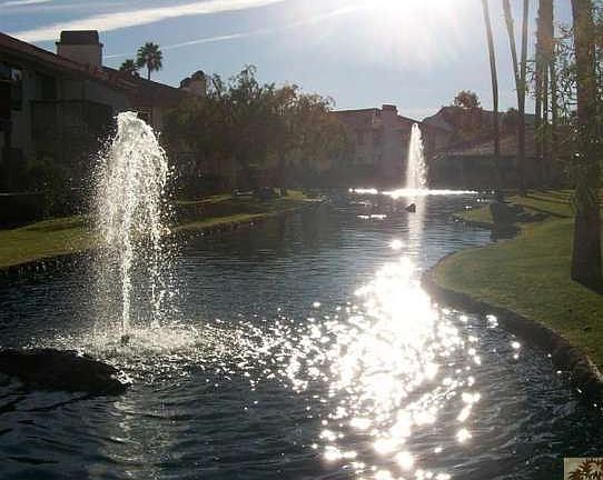 On the lake...what a view of swimming pool, greenbelt and south Santa Rosa mountains. Lower unit with 2 bedrooms + 1 Bath, resort style gated complex in the heart of Palm Desert close to everything. Amenities include 2 pools, spa, fitness center, dry sauna, clubhouse, san volleyball Ct., 2 lighted tennis courts, meandering lake/waterfalls features throughout the complex and a beautiful lake that has numberous fountains, and greenbelt areas. Granite counter tops in kitchen and bathroom. Freshly painted, new carpeting in both bedrooms, 3 ceiling fans, one in each bedroom, living room and dining room has fabulous new fixture. If you like convenience location is perfect. Brokered And Advertised By: Coldwell Banker Residential Listing Agent: Debbie Greif