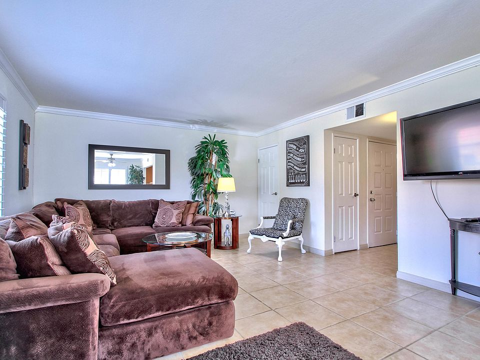 GORGEOUS 2 bedroom/2 bath, Bright Corner Unit in Gated Palm Lake! Unit features plantation shutters throughout, stainless steel appliances and newly remodeled bathrooms with high end designer showers. One level villa, no one above you, comes completely turnkey furnished. Just steps to the pool, clubhouse with gym, volleyball and tennis courts. 2 designated parking spots. With low HOA dues and a great central location, this beauty won't last long!