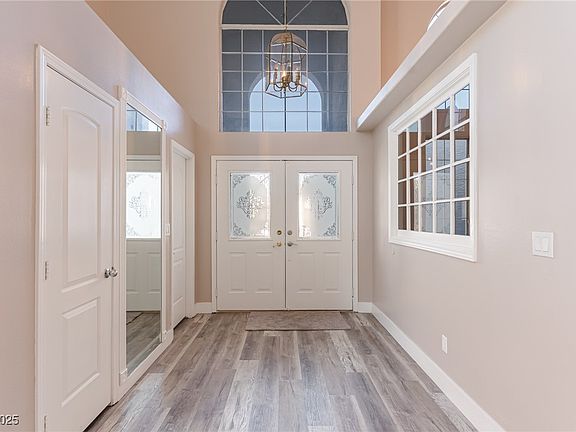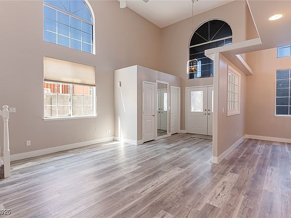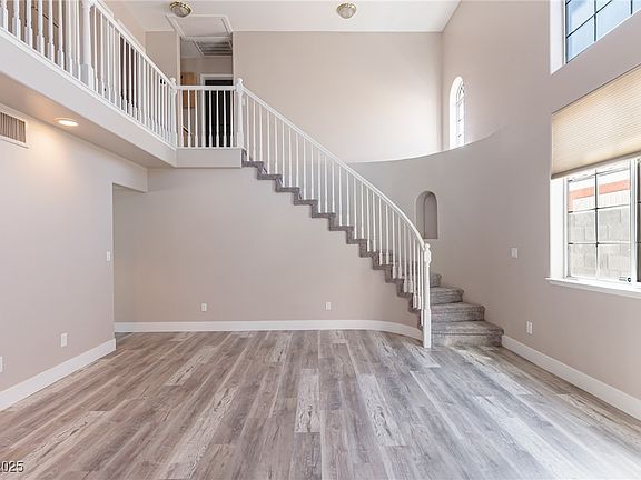 Move-In Ready 4-Bedroom Home with No HOA! Discover this beautifully updated 4-bedroom, 3-bath home perfectly situated in a quiet cul-de-sac just minutes from freeways, shopping, UNLV, top schools, and the Las Vegas Strip. Step through the gated courtyard and double glass front doors into a bright, open interior featuring soaring ceilings, a cozy fireplace, and two-tone paint throughout. The modern design includes a blend of wood laminate, tile, and new carpet flooring, plus freshly painted stair rails for a crisp, contemporary look. The spacious primary suite is located on the main level, providing privacy and comfort with dual sinks, a separate shower, and a luxurious Jacuzzi tub. Upstairs, you'll find three additional bedrooms. The backyard is built for low-maintenance enjoyment with desert landscaping, turf, a fully covered patio.