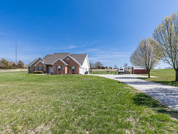 This home is on a picturesque 3.4 acre property, complete with fruit trees, flowers and serene tranquility of country life, while maintaining a close proximity to the city of Bolivar. You are welcomed into this spacious home by high ceilings and a calm color scheme. There are several gathering areas, whether they be dining or living. The 24x35 addition brought a grand open space, with high ceilings, beautiful windows, a gas fireplace and even an additional closet for even more storage. The kitchen features granite counters, beautiful cabinetry and a walk-in pantry. The appliances are in beautiful condition. The layout is ideal for someone who enjoys cooking. There is a family room that is open to the kitchen and is perfect for visiting with guests while snacking. The main bedroom is ample, with a tray ceiling and lots of natural light. The ensuite bathroom has a beautiful jetted tub, gorgeous tile work and a large walk-in closet. A second bedroom offers another ensuite bathroom, featuring a tiled walk-in shower and a walk-in closet. The other 2 bedrooms share a bathroom, and also feature walk-in closets and are a great size. This home comes with a zoned HVAC system and 2 water heaters to insuring that everybody is comfortable. There is no carpet in this home, only tile, hardwood and LVP throughout. There is a storm shelter in the garage, to keep you safe when the weather is scary. The location is ideal, being less than 3 minutes from Highway 13, you have easy access to dining in Bolivar or shopping in Springfield. The excellent build quality and privacy of the acreage makes this the ideal property to call home.