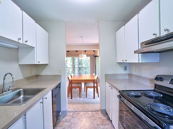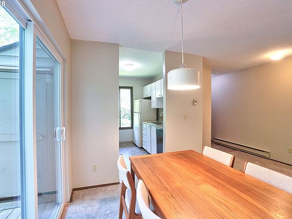 Affordable, convenient, serene! Unwind with wall to wall windows looking out to an evergreen forest. TWO balconies. Newer vinyl sliding glass doors. New carpet, vinyl floors, full paint. Bathroom upgrades. Full size in-unit laundry. Wash/Dryer included. HOA fee includes water, sewer, trash, pool, landscaping, exterior maintenance, management. Near PCC Sylvania, I-5 access.