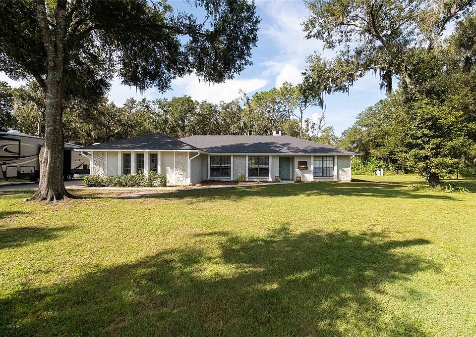 Discover your own piece of paradise with this remarkable home that checks all the right boxes. Welcome to a property that offers more than just a house—it's a lifestyle. As you drive down the peaceful, tree-lined street, you'll know you're headed to your forever home, the ideal gathering place for your loved ones during the holidays and the canvas for countless future memories. This 3-bedroom, 2-bathroom split-plan home has been thoughtfully updated to reflect modern farmhouse elegance. Step inside to find wood plank tile flooring that adds warmth and character to the living spaces. The kitchen is a culinary dream with a deep farmhouse sink and custom concrete countertops as well as butcher block counters, blending form and function seamlessly. Both bathrooms feature uniquely customized vanities, adding a touch of luxury to your daily routine. However, the true magic of this property awaits outside. Embrace the glorious Florida weather in your spacious and screened lanai, perfectly complemented by a large 16X32 concrete pool, creating your own private oasis. The pool was just changed to a saltwater system! Nearby, a pergola beckons you to grill your dinners at sunset and gather around a cozy fire pit as the evening unfolds. With over an acre of land, this property provides ample space for all your recreational toys, and the absence of an HOA means you have the freedom to make this space truly your own. A brand new roof, new kitchen appliances and a water softener were all added only 9 months ago! Don't miss the chance to make this your forever home—a place where comfort, style, and the allure of outdoor living combine to create an exceptional lifestyle. Schedule a viewing today and prepare to fall in love with every aspect of this wonderful property. All information and sizes are believed to be accurate but should be verified by buyer and or buyers agent.