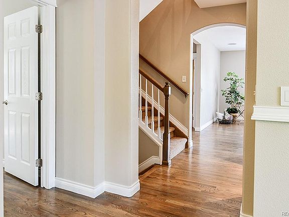 Beautiful Bradburn Village main floor master backs to neighborhood pocket park. Well-kept two-story home begins with a wide porch framed by beautiful landscaping, and opens to a fully finished home with just the right details. Formal dining room with chandelier is convenient to a distinguished kitchen. Granite counters, custom cabinets, breakfast bar, stainless steel appliances. The living room enjoys views to the backyard, glass storm door, gas fireplace, custom entertainment shelves and drawers. Laundry includes washer and dryer, offers access to 2-car alley-loan garage. Main floor master suite includes walk-in closet, linen closet, and five-piece master bath. Upstairs reveals two bedrooms, each with vaulted ceiling, one incl. built-in desk. Full bathroom. Downstairs, two add'l bedrooms with built-in shelves, two closets each, as well as full bathroom.