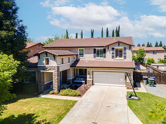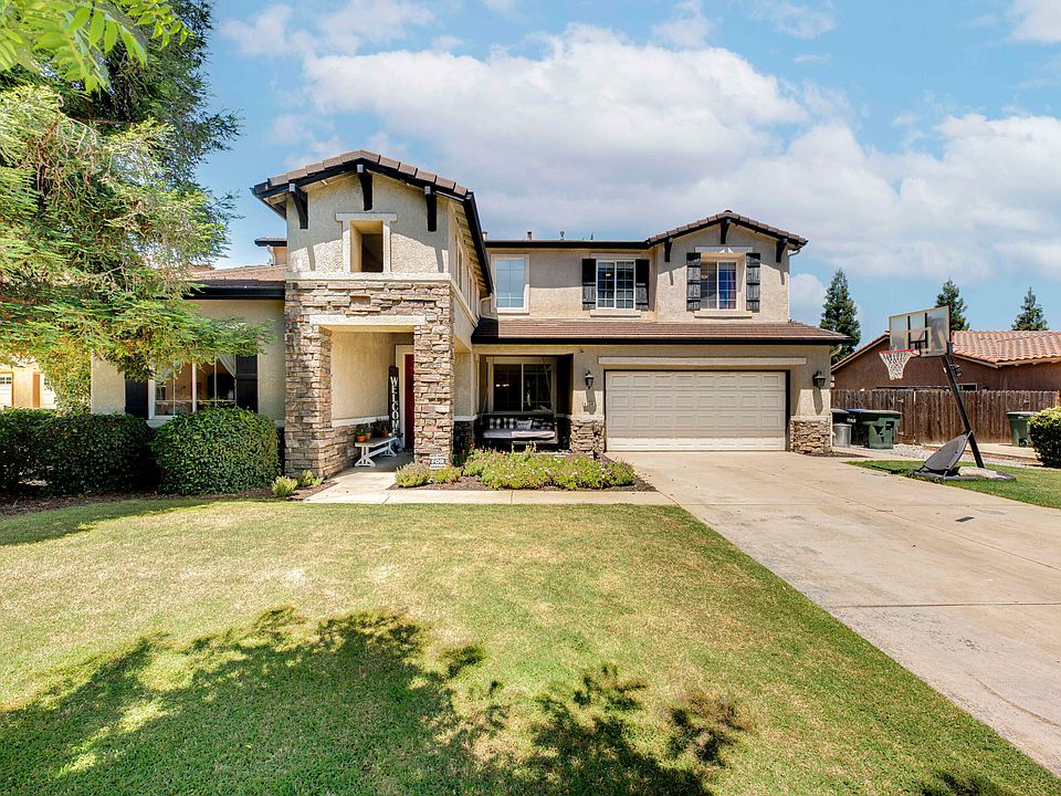 Located on a charming cul-du-sac in a quiet neighborhood in Northwest Visalia, this spacious home is surrounded by lush greenery and mature trees. This is an ideal floor plan for a large family - 5 bedrooms and 3 bathrooms, 3,000 square feet of living space and soaring 2-story high ceilings in the living and dining rooms with many windows to let in natural light. The family room features a stone fireplace and opens into the kitchen with an island and a breakfast bar. The bedrooms are all located on the second floor, with the primary suite featuring dual vanities, a walk-in closet, walk-in shower and a soaking tub. The backyard has a covered patio and plenty of space for the kids. Several key upgrades including wood-like tile flooring, carpeting, new interior paint, energy efficient stainless steel appliances, updated laundry room, and a tankless water heater. This is a special home which is move-in ready and will not last long!
