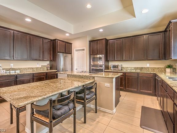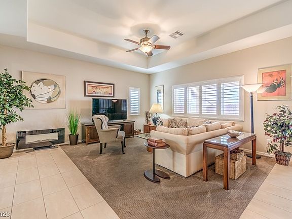 Beautiful 3 bedroom, 3 bath home with stunning interior finishes located in the Tivoli neighborhood of Mountain Falls. Kitchen boasts ample counter space, stainless appliances, built in oven and microwave with cooktop on the island. Upgraded tile flows through the home to the back patio that offers plenty of covered area for outdoor living overlooking the private back yard. Plantation shutters throughout, reverse osmosis, air purifier are just a few of the upgrades. Primary suite has dual sinks, walk in tub, spacious closet. Mountain Falls neighborhood offers a main clubhouse for all ages with restaurant, pro shop, 18 hole golf course, driving range and putting greens, 3 pools, easy access to HWY 160 for quick trip to Vegas!