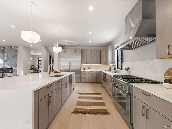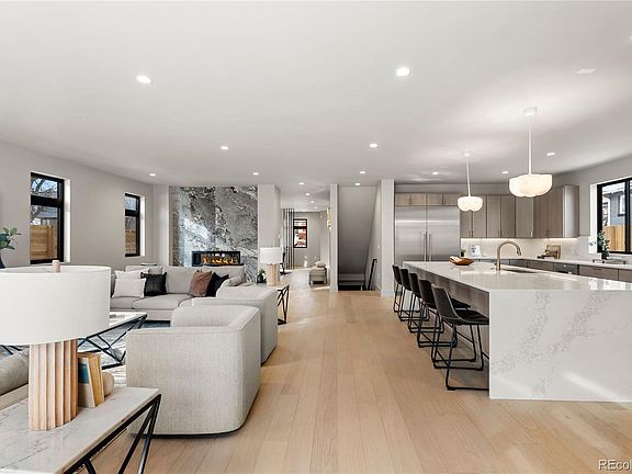 Meticulously crafted by MAG Builders, this newly constructed residence epitomizes contemporary sophistication in the heart of West Highland. Every detail has been thoughtfully curated to offer an unparalleled living experience, blending architectural elegance with modern functionality. The main level is a testament to seamless indoor-outdoor living, anchored by an exquisitely designed chef’s kitchen, outfitted with top-tier stainless steel appliances, custom light wood cabinetry, an expansive quartz island, and a generous walk-in pantry. The adjoining living area is bathed in natural light from floor-to-ceiling windows, creating an effortless flow to the covered patio and private yard. A two-sided marble fireplace serves as a stunning focal point, seamlessly connecting the dining area, where a built-in wine display adds an element of refined luxury. A main-floor bedroom offers versatility as a private guest suite or office space. The upper level is highlighted by a tranquil primary suite, featuring a private balcony, an expansive walk-in closet, and a 5-piece bath with a freestanding soaking tub, oversized glass-enclosed shower, and dual vanities. Three additional well-appointed bedrooms, two full baths, and a convenient laundry room complete the level. The third-floor loft serves as a stylish retreat, complete with a wet bar, powder bath, and direct access to a sprawling rooftop deck offering breathtaking views of Downtown Denver and the Rocky Mountains. The fully finished basement is an entertainer’s sanctuary, featuring a sprawling recreation room, a built-in wet bar, a dedicated fitness studio, and a private guest suite with an en-suite bath. Additional highlights include a mudroom with custom storage, an attached 2-car garage, and professionally landscaped outdoor spaces. Positioned on a premier corner lot in one of Denver’s most sought-after neighborhoods, this home offers effortless access to acclaimed restaurants, boutique shopping, and scenic parks.