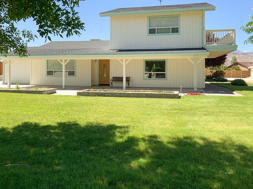 Gorgeous, 3 bedroom 3 bathroom home with ample space to spread out. Spacious living room with vinyl plank floors, lots of windows and natural light. 2 bedrooms and bathroom downstairs and main bedroom quarters upstairs with walk in closet and large bathroom with oversized walk in shower and double sinks. Deck that overlooks the Sierra range. The kitchen has whitewashed cabinets and granite counters. Corner window over the sink looking towards the garden area and mountain view. Large RV pad behind the fully finished and insulated 4 car garage that accommodates the laundry room, extra storage and 3/4 bath. The west side of the property has a large shop with two large bays and two quad or motorcycle bays. Great for a tradesman or a collector.