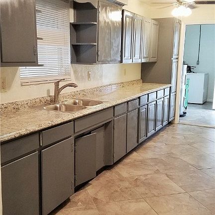 Be pleasantly SURPRISED. 3 Bedrooms 2 full size modern bathrooms, new ceramic tile flooring throughout coupled with an EXTRA LARGE kitchen with TONS of cabinets and pantry, carport plus two storage sheds around back plus backyard open tiled patio area. Large inside laundry room: you can easily add a freezer. Of course Central Heat and Air. The home is much larger than it seems from the outside. You will be pleasantly surprised no wasted space. Your chain link fenced back yard abuts a pond on acreage so there are no neighbors on the backside. Located on a very quiet, extremely low traffic dead end cul-va-sac street granting plenty of privacy. DOUBLE wide concrete driveway can easily park big vehicles. $1,950 mo. First & Security Deposits required prior to moving in. Applications required on all adults living on premises. No evictions in past 10 years. Interior newly painted light gray. So the blue in the photos is wrong. NOW available.
