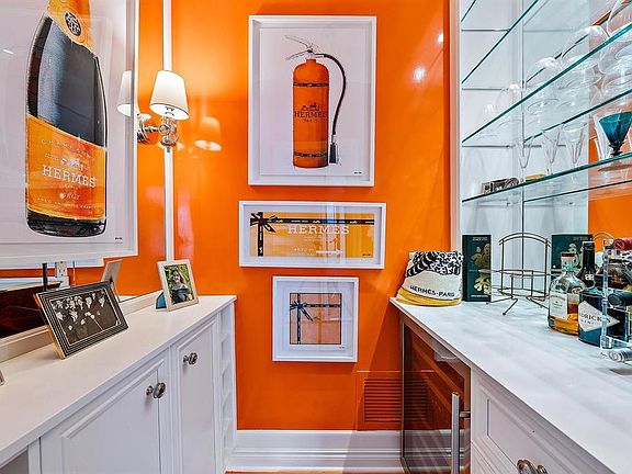 High floorLaquered millworkTasteful wall coveringsSpacious condoLacquered hardwood floorFrench lacquered hermes barFine quality hardware