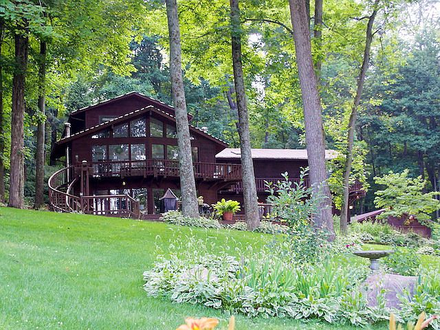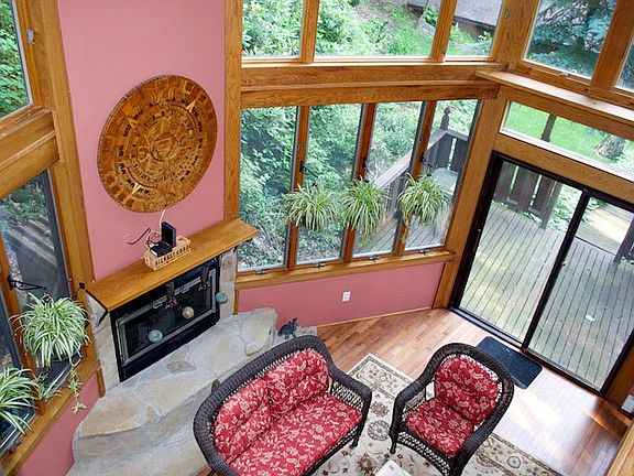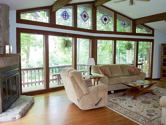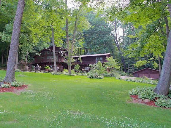 Looking for the perfect home with a getaway feeling... Look no further. This amazingly landscaped 2.5 acre contemporary style home has a gorgeous lake view with an amazing sunrise. The huge family room has cathedral ceilings & a beautiful fireplace to cozy up by on a cold winters night, or you can watch the deer in your backyard while relaxing by the fireplace in the two story great room. The kit. offers stainless steel appli. & granite counters w/ a roll around island. Large windows allow light to pour in the open flr. plan, while the tall trees shade where needed. Many updates include: extensive master suite remodel,stained glass windows. hardwood flrs, C/A & more. Over 4,000 sq.ft.