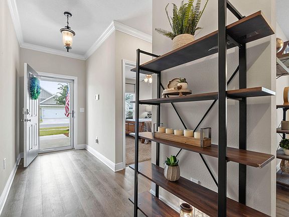 Welcome to Firefly of Hammock Bay, where your dream home awaits! Get ready to fall in love with the 'Dover floor plan,' a stunning home that has so much to offer, and it's ready for you to move in without the wait.One of the standout features of this home is that it's a Smart home with a video doorbell, perfect for ensuring your safety and convenience. As you step inside, you'll be greeted by a beautiful kitchen with granite counters, an oversized island with a breakfast bar and storage cabinets, and power outlets. The stainless steel Whirlpool appliances and purified kitchen sink water dispenser make this kitchen a cook's dream. Plus, there's a large walk-in pantry for ample storage space.The open concept design of the family and dining area creates a warm and inviting space... perfect for entertaining guests. You'll love the 9 ft ceilings with crown molding in the kitchen, dining, and family room. The luxury waterproof vinyl plank flooring adds a touch of elegance, while the extra tall 6' baseboards, canned lighting, and wide door openings provide a spacious feel.