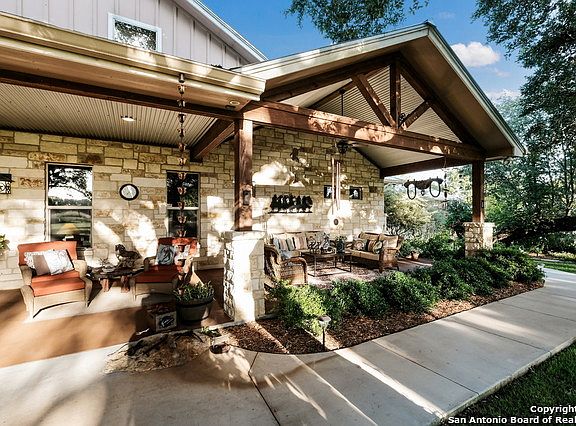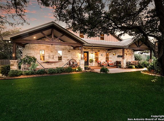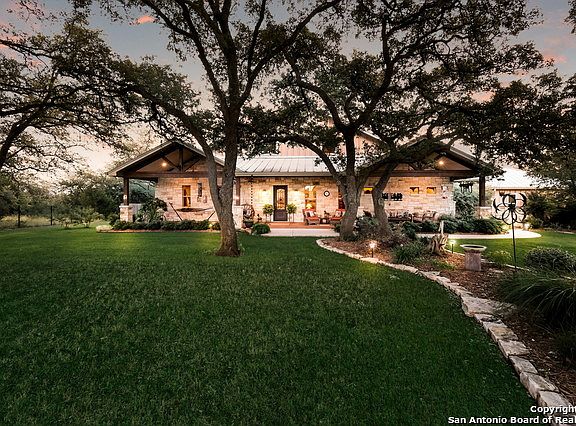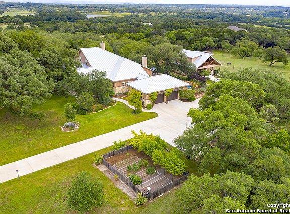 Exquisite Hill Country retreat~Impeccable home w/lush landscape, metal roof, beautiful patios~Built with Unsurpassed Craftsmanship~Home+guest house gives your family approx 4300 sqft living space~Main home features Custom cabinetry+leathered granite counters+Impressive master suite w/2 Master Closets~Barndominium entails a "drive-thru" shop, AC/Heat workshop & Full Guest quarters~You will be immediately immersed in this homes Warm, Welcoming charm~Perfect for family gatherings & entertaining or simply RELAX
