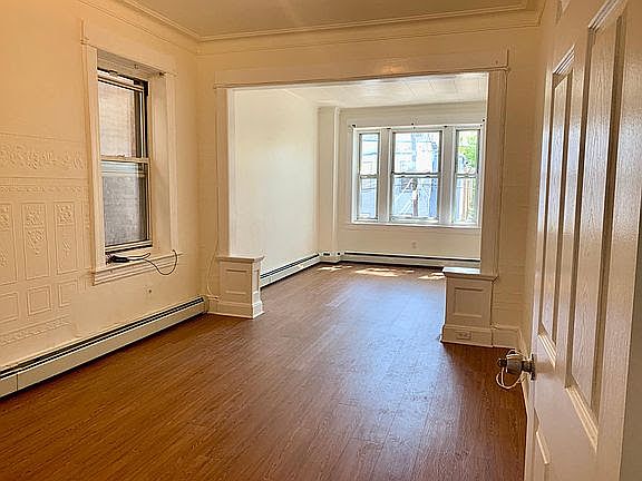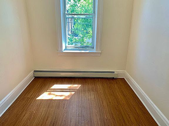 Sunny, southwest facing 2-BR 1-bath apartment on second floor with large living area/den in a great commuting location. Smaller bedroom can be used as a work-from-home office. 10 minute walk to Journal Square PATH station with trains and buses to NYC, Hoboken, and Newark all less than a 30 minute commute away. Citibike 2 blocks away. Various local grocery and merchandise stores nearby. Convenient to downtown Jersey City, Hoboken, and New York City for bars and restaurants. Hot water included. Laundromat one block away. Fridge and gas range provided. Baseboard heating. 12-month lease. Security deposit 1.5 months. Good credit and background check required. Ideal for small families, professionals, and students. No pets. AVAILABLE NOW. NO BROKER FEE Owner responsible for sewer, garbage, and hot water. Renter is responsible for electric, gas, cable/wifi. No smoking allowed. No pets allowed.