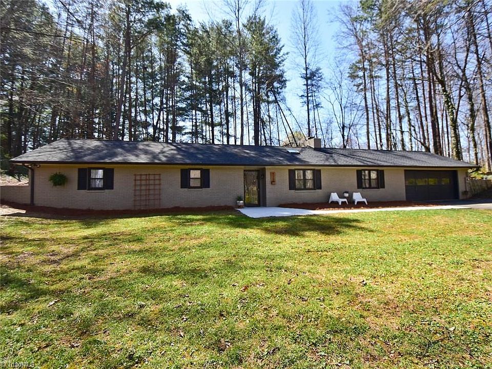 Brick ranch 3 bedroom and 2 bath. Beautiful see through rock fireplace, eat-in kitchen with breakfast bar plus separate dining room. In neighborhood yet home is on large private wooded lot with winding private drive. Very little mowing! Convenient to Winston Salem