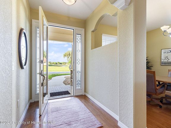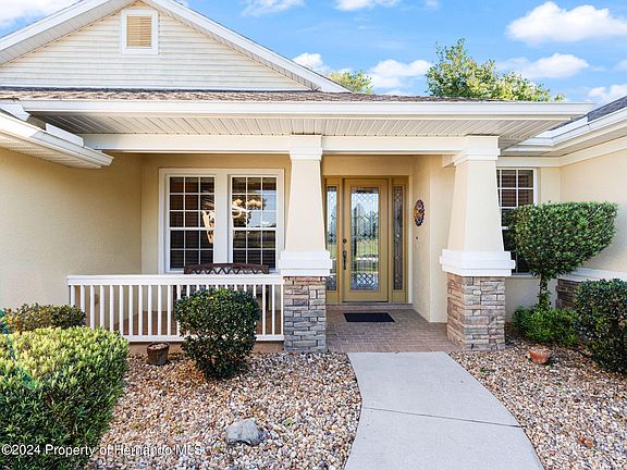 ACTIVE, UNDER CONTRACT. Impeccable! Lovingly Maintained by original owners. Home is an Alexander custom built, Van Gogh model that shows absolute Quality throughout. It balances modern comforts with timeless charm. Some of the many features of this home are; great room floor plan with lots of natural light, beautiful soaring tray ceiling and crown molding, gas stove, gas hot water heater, , 3 bedrooms, Office, Dining Room, Kitchen with under cabinet lighting, Breakfast Bar, and roomy Breakfast Nook. The serene primary suite offers a private escape which includes a sitting area, and a double walk-in closet. Primary bath has a soaking tub, and a large walk-in shower, private toilet area, and his & her vanities. Enjoy the private backyard in your extra-spacious screen enclosed Lanai, which is wired for a hot tub. The welcoming front porch offers peaceful views of the 8th hole of the golf course. Beautifully landscaped yard, with curb-a-lawn beds. 3 car garage is tandem style. Located in the serene Golf Course Community of Hernando Oaks, with easy access to Tampa, and all amenities.