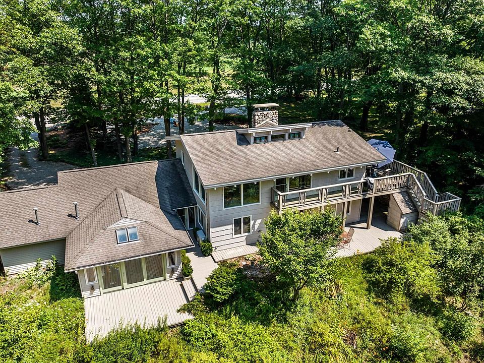 Welcome to a completely updated and enchanting 4-bedroom, 4-bath cottage-style home nestled on a wooded 0.58-acre lot in the heart of Leelanau County, just minutes from Lake Michigan, Sleeping Bear Dunes, and Leland. With 2,594 sq ft of living space, this thoughtfully designed home offers a versatile two-level layout featuring two bedrooms and two full baths on each floor, perfect for flexible living or hosting guests. Highlights include vaulted and beamed ceilings, skylights, two stunning stone fireplaces, a sunroom, a den, and an upper-level with serene woodland and golf course views of Sugar Loaf’s Old Course just across the street. The beautifully landscaped grounds boast multi-level decks, a sunset-facing grilling patio, a covered front porch, and a balcony overlooking the fairway. A three-car garage with a circular driveway and carport ensures comfort and convenience year-round. Whether you're seeking a peaceful full-time residence or a Northern Michigan getaway, this charming, light-filled home blends rustic warmth with timeless appeal in one of the region’s most desirable locations. With fully updated interior and new septic system all you have to do is enjoy the comforts of this home.