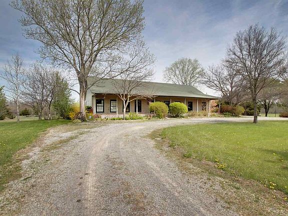 Unique and elegant, yet full of country charm. This ranch-style home, custom-built in 1993 with half-log veneered planks, packs just under 3600 square feet into spacious living areas where no one will feel crowded. Imagine time spent reading on the covered front porch. Coming inside, immediately look up to enjoy the vaulted wood ceiling in the main living area. Foyer leads to dining room with so much storage, all behind cabinetry doors. Windows in the dining room are adorned with sliding stained glass panels that beg admiration. Kitchen with 3 sky lights has more cabinet space, prep space, island with prep sink, nice appliances and the massive pot rack stays. Breakfast or sitting area has a massive native stone fireplace embedded with a sunflower design. Flooring in main living area is white-wash wide-plank wood. Off the breakfast/hearth room is a mud room connecting to the 2-car sideload garage. Main floor has one large master bedroom with adjoining sitting room, large bath with laundry area and walk-in California closet. Two more finished rooms were used as offices for each homeowner. Both have built-in bookcase space and the larger office has deck access. Rounding out the main floor is a large half bath. Walkout basement features two bedrooms and a large full bath. One bedroom has a false wall and behind it is a walk-in safe. A small bonus room was used for gift wrap and there is also a huge walk-in cedar closet. Storage galore is available in the 17x50 basement unfinished area. Deck faces east for morning light and afternoon shade. Enjoy the decorative touches of post rock and large boulders. Property includes 3.5 acres, irregular in shape, with often-seen deer and turkeys. There's a small lean-to shed, great for tool storage. Home is being sold in as-is condition.