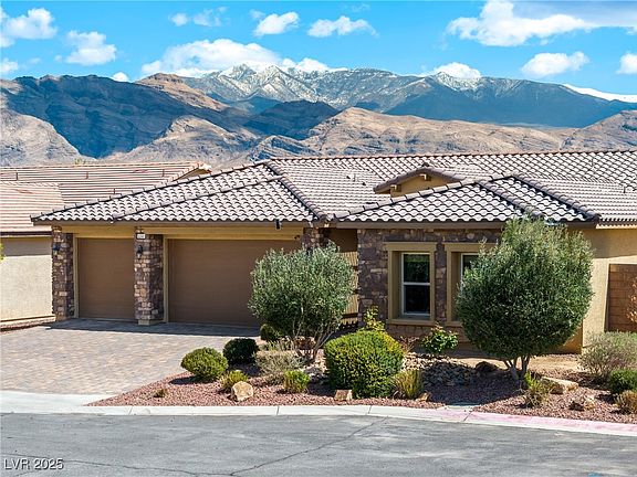 Welcome to your dream home in Mountain Falls, Pahrump! This stunning corner 2,083 sqft home, built in 2017, is situated on over 1/4 acre on a cul-de-sac. Featuring an upgraded rock exterior and a paved driveway, the home features a gorgeous great room with a coffered ceiling and custom lighting. The chef's kitchen is a highlight, complete with stone wall, granite counter tops, walk-in pantry, and easy access to a spacious covered patio. The primary suite offers coffered ceilings, a private patio door, a custom walk-in closet, and an electric fireplace. This 3-bedroom, 2-bath home includes a 3-car garage with EV charger, laundry room with sink and built-ins, stainless appliances, and numerous upgrades throughout, including ceiling fans and window coverings. Experience the Mountain Falls community with amenities like pools, a spa, gym, golf course, restaurant, and parks—all less than an hour away from Las Vegas. Don’t miss this must-see property!