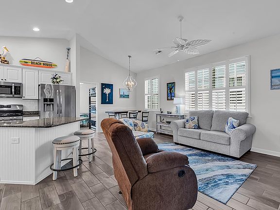 This pristine, move-in ready home is immaculately maintained and thoughtfully upgraded throughout. Built in 2017 and nestled in a sought-after natural gas community, it combines elegant design, modern comfort, and the perfect space for indoor and outdoor entertaining. Inside, the wonderfully open floor plan is accentuated by soaring vaulted ceilings and natural lighting. Sleek pocket doors enhance flow and function. Large windows are dressed in classic plantation shutters, adding both style and privacy. Wood style tile flooring runs throughout the living, kitchen and dining areas. The kitchen offers fully trimmed raised panel white cabinetry complete with granite countertops, recessed lighting, a spacious island and breakfast bar, stainless steel appliances and a gas cooktop. Each of the two very generously sized bedrooms could serve as a primary bedroom with one offering back steps down to a huge patio and your own private oasis. Your backyard backs to a lush, wooded area. The screened room beneath the home is an entertainer's dream. Featuring a mounted large screen television, more than ample seating space and dining area and separate room with a built-in wet bar, the screened room is perfect for gatherings or just rinse off in the adjacent enclosed outdoor shower and unwind after a day at the beach. Multiple storage rooms add practicality and convenience to this exceptional home. TVs, bunk beds, exterior storage shed and beverage cooler convey. With fabulous restaurants, shops, golf courses, entertainment, water sports and the beautiful blue Atlantic Ocean and its white sandy beaches just a short drive away, this home offers the ideal blend of comfort, style, and location. Whether looking for a full-time residence or a coastal retreat, this is the perfect spot to call home. Don't miss your chance to own this exceptional property! Come find your place in the sun today! Square footage is approximate and not guaranteed. Buyer is responsible for verification.