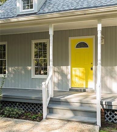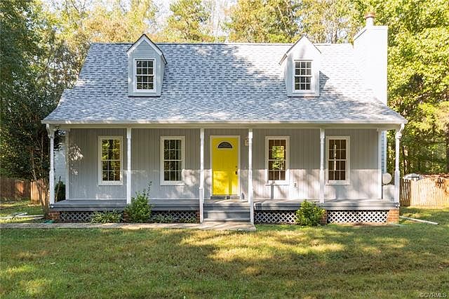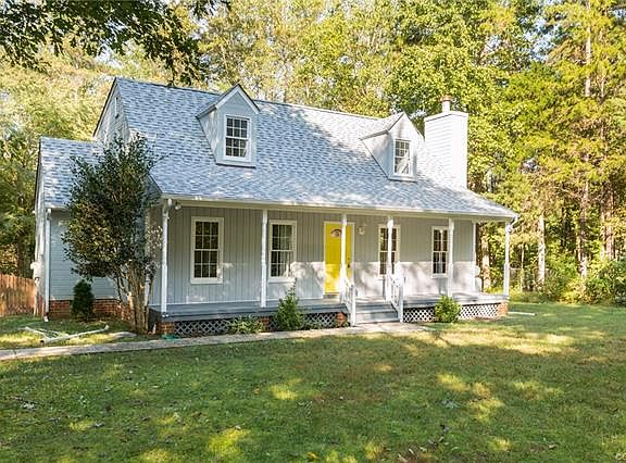 Charming and totally updated Cape with fantastic covered country front porch and 1st floor master suite! 1 cleared acre tucked away behind mature trees for natural privacy. Brand new dimensional roof, new board and batten front siding, newer windows, fenced in yard and detached storage shed. Inside boasts fresh neutral grey paint throughout! Living room has a gas fireplace (not hooked up, just needs propane tank) with decorative mantel, new hardwood floors and is a great open plan that flows to dining area and dreamy kitchen! Kitchen has classic white cabinetry, granite counters, new stainless appliances (including the refrigerator) and access to the rear deck that overlooks the yard...a great place for entertaining friends! Spacious laundry room with extra storage space. 1st floor master suite with en-suite full bath that boasts new vanity/vanity top, new flooring and fixtures. Upstairs are 2 LARGE bedrooms with new paint and carpet and an updated full hall bath with tub/shower combo, stone vanity top, new flooring and fixtures. This home is totally move in ready!