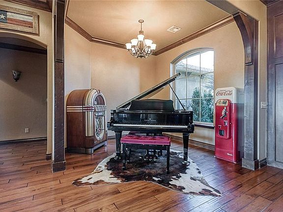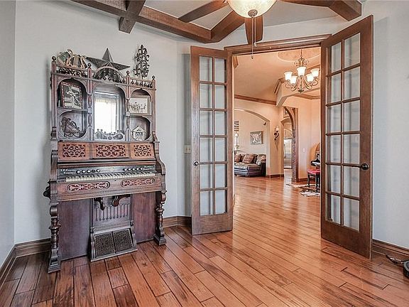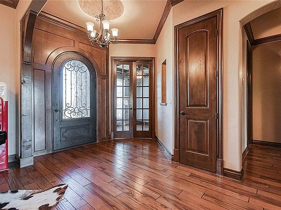 QUALITY UNLIKE ANYTHING YOU HAVE SEEN IN THIS PRICE RANGE. Beautiful craftsmanship throughout. Very open floor plan, tall ceilings throughout. Huge rock fireplace in living area with built-in bookshelves on each side. Over-sized crown molding, African Mahogany solid wood floors, 8 ft. solid wood doors, chef's kitchen with stainless steel appliances, 6 burner commercial gas cook top, double ovens, granite counters. Nice study with French doors, 2nd living area being used for piano room - could be formal dining. Master bath with jetted tub and walk-in shower ~ beautiful tile work. Gorgeous home on 1/2 acre, storage shed in backyard. Home sits on an elevated lot with a great view of downtown OKC.