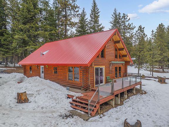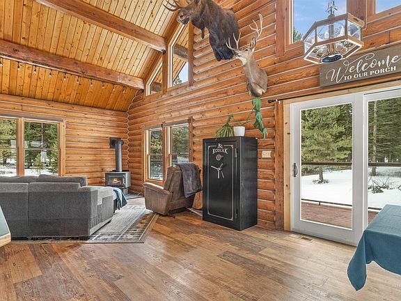 Nestled on 10 serene wooded acres, this charming log home offers the perfect blend of rustic tranquility and modern comfort. With big windows that frame breathtaking views, you'll feel immersed in nature while relaxing in the cozy glow of the wood fireplace. The home features two spacious bedrooms and bathrooms on the main level, making it an ideal choice for those seeking easy living. The large loft adds versatility and can be used as a third bedroom or family room. Just a stone's throw away, a 30x48 shop with a 12x30 man cave awaits your hobbies and projects. There is also a 24x36 parking garage, lean to shed for wood storage or horses, and a ride-on/ride-off snowmobile storage area. Fully fenced for your livestock or just your own privacy and security, this property is an outdoor enthusiast’s paradise, with nearby access to hiking, snowmobiling, and four-wheeling adventures. Embrace the opportunity to create lasting memories in this idyllic retreat!