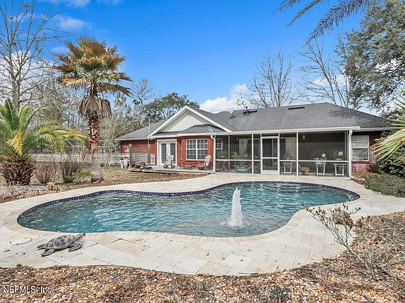 Beautiful Brick Home on Over One Acre Fenced Back Yard boasting with a fabulous Salt Water Pool. Open floor plan with 3 Bedrooms, 2 Baths, Great Room with Fireplace, Screened Porch to enjoy the Floridian evenings. A big kitchen with spacious Counter and many Cabinets and a Separate Dining Area. The Kitchen also offers a comfortable Breakfast Bar where you can start your mornings at. A generous Pantry offers lots of space, a Laundry Room & a 2-Cars Garage with a Huge Driveway rounds up the practical part perfectly. The Home is Romantically surrounded by trees and located close to Interstate, to Schools and Shopping.