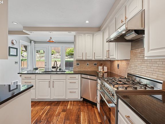 Don’t miss this gem! This beautifully renovated Council Crest home combines modern luxury with timeless charm, set in a lush, trail-lined neighborhood known for its love of nature and top-rated schools - a perfect backdrop for balanced, elevated living. Meticulously renovated from the foundation up in 2005, with nearly $250,000 in upgrades - including new plumbing, electrical, sewer line, tankless hydronic heating, heated flooring, and a fully equipped separate living quarters—this home delivers comfort, style, and flexibility.Inside, warm wood floors, vaulted ceilings, and full-height windows flood the space with natural light. The elegant dining room opens to a wrap-around porch with peek-a-boo mountain views—perfect for soaking in the serene surroundings.The custom gourmet kitchen is designed for the modern chef, featuring high-end stainless steel appliances, granite countertops, and an oversized island with seating that connects seamlessly to the tranquil backyard. The expansive living room is ideal for both cozy nights in and large gatherings, with graceful architectural details and dual outdoor access.Offering 5 bedrooms, 5 bathrooms, and a versatile bonus/flex space, this home adapts to your needs. The primary ensuite is a luxurious retreat, complete with mountain views, a cozy fireplace, a private balcony, and a spa-inspired bath with a tiled walk-in shower and dual vanity.The backyard is a private sanctuary, featuring a large, leveled lawn, native low-maintenance landscaping with irrigation, and artfully placed stonework for a peaceful, grounding experience.All just minutes from Council Crest Park, Marquam Trail, NW 23rd, and with easy access to downtown PDX, OHSU, Nike, Intel, and more—there’s truly nothing like it on the market. [Home Energy Score = 5. HES Report at https://rpt.greenbuildingregistry.com/hes/OR10231871]