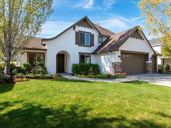 Welcome to this beautifully updated 4-bedroom, 3.5-bathroom home nestled in one of Eagle's most desirable neighborhoods. With 3,179 square feet of living space, this home features a dedicated office on the main level and a luxurious main-floor primary suite! Freshly painted inside and out, it showcases granite countertops, abundant natural light, and a spacious living! Upstairs, enjoy a generous loft perfect for a second living room or play area, oversized bedrooms, and ample storage throughout. The beautifully landscaped yard includes mature trees and fruit trees, with a covered patio ideal for relaxing or entertaining! A 3-car garage provides plenty of room for vehicles and gear! Located near top-rated Eagle schools, with access to scenic walking paths and a sparkling community pool, this home offers the perfect balance of comfort, space, and location!