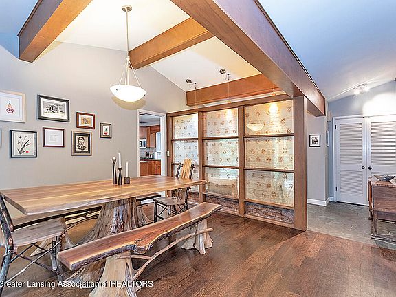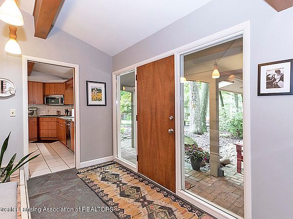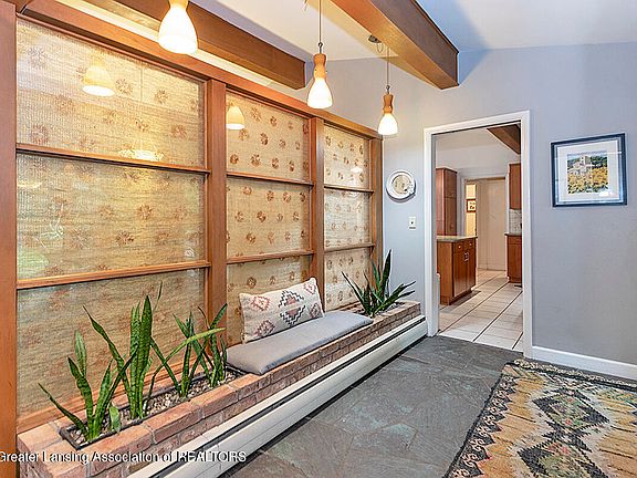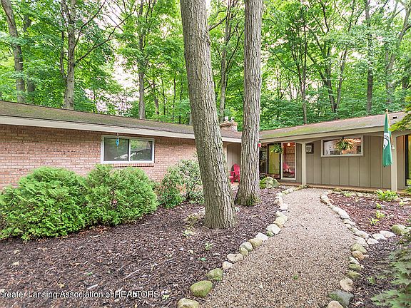 Spacious and open Mid-Century-Modern Okemos ranch (2598 s.f.) Four bedrooms/ 2.5 baths. Vaulted ceilings. Walls of windows. Private, fenced back yard on cul-de-sac in the popular Tacoma Hills neighborhood. A covered brick walkway leads to the front door entrance and spacious slate-floored foyer. Note the unique glass, silk-panel wall/planter divider. Stunning and spacious living/dining great room has wall of windows, vaulted ceiling, quality hardwood flooring, full brick wall with gas fireplace (insert 2021) and a 17-foot raised hearth Move on to a kitchen to love Lots of space for informal dining gatherings with sliders to the patio, vaulted ceiling with skylight, abundant storage in granite countertop cabinets and granite 3.10 x 5.4 island; S/S appliances.